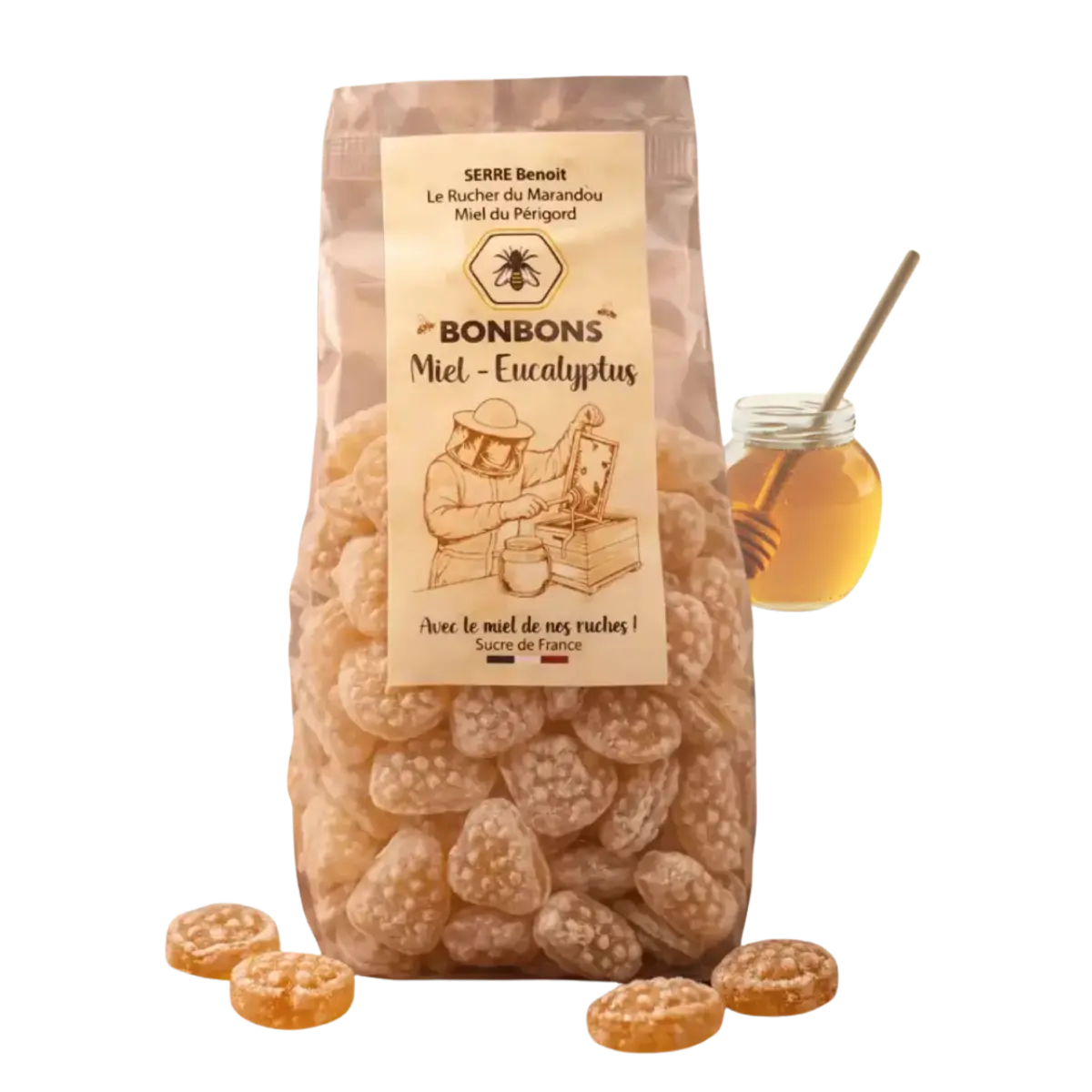 Le miel utilisé dans ces bonbons est 100 % produit par nos abeilles en Périgord et récolté artisanalement par Benoît Serre, apiculteur au Rucher du Marandou (24260 Saint-Avit-de-Vialard).