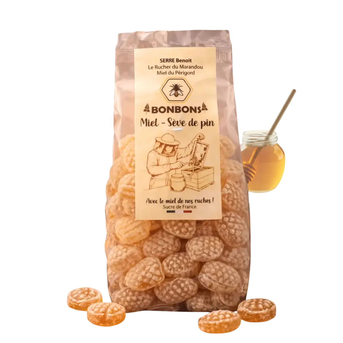 Les bonbons au miel du Périgord version saveur sève de pin sont élaborés avec soin par un confiseur artisanal de Vendée, à partir du miel récolté par Benoît Serre au Rucher du Marandou (24260 Saint-Avit-de-Vialard).
