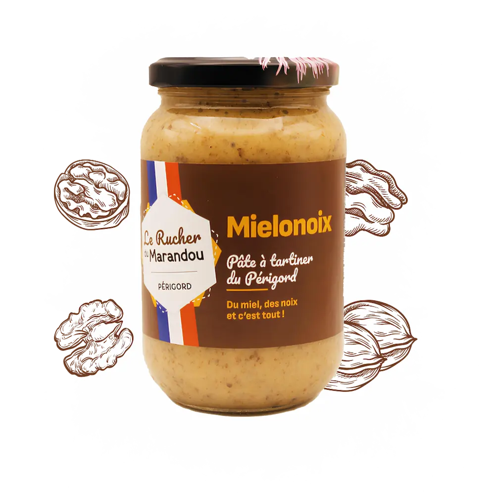 Le Mielonoix du Périgord est une pâte à tartiner artisanale qui associe la douceur onctueuse du miel crémeux de Dordogne au croquant délicat des noix françaises.